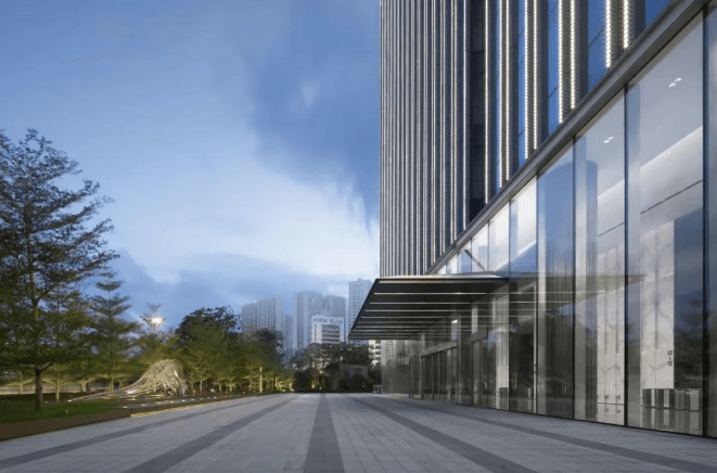 建筑设计:采用半隐框玻璃幕墙技术,搭配双层 LOW-E 超白玻璃幕墙,外观高级,与滨海商务场景完美契合,且坚固防震、隔音保温性能突出,已获得 LEED 金级认证。约 11.7 米的挑高大堂,搭配花岗岩地面和石膏板吊顶,彰显商务气质。