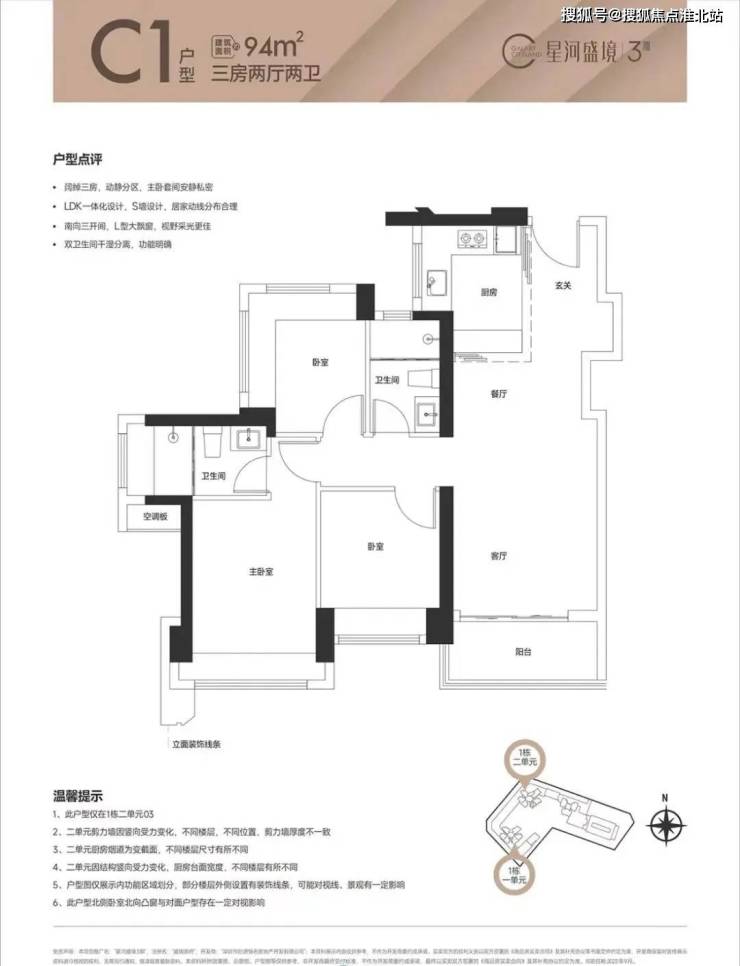 94㎡的3房2厅2卫(1栋2单元06户型),设计的是竖厅南北通透格局,全屋飘窗设计,主卧南北通透双飘窗,U型厨房,卫生间干湿分离,得房率76%(不含赠送),阳台主朝东北向。