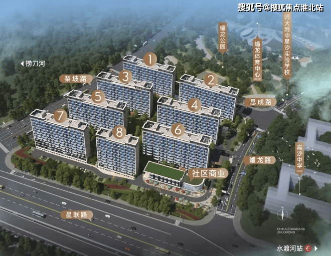 生态配套:项目周边有长沙园林生态园、松雅湖、捞刀河及白沙河四大生态环绕,蟠龙公园(规划)、蟠龙体育中心(规划)坐落于项目北侧。