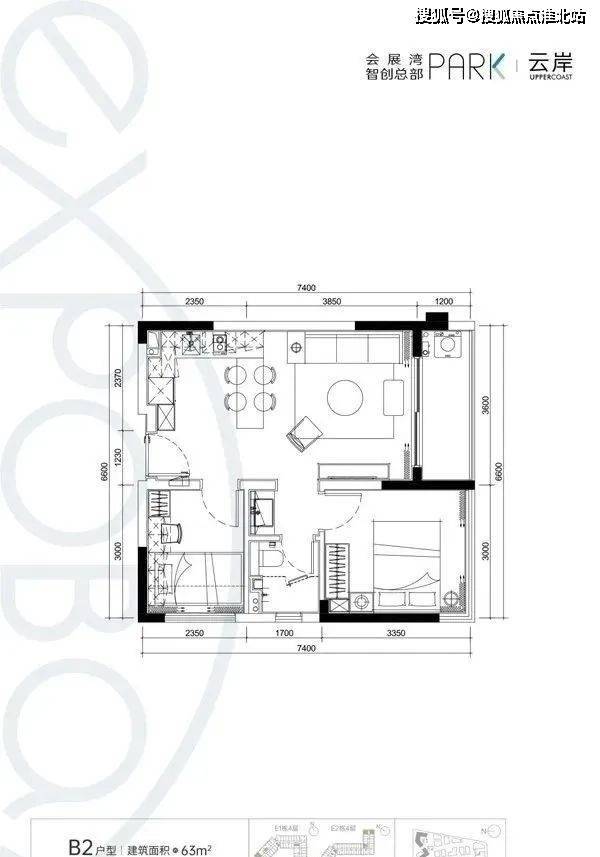 【B2户型:63㎡】房型:两房一厅一卫朝向:E1、E2(西南、东南)户型优势:端头位、双面采光、无敌景观