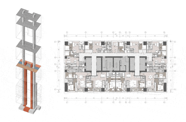 在外围框架柱内设置足量的型钢,以提高其竖向刚度,并在避难层均匀布置伸臂桁架,极大增强塔楼侧向刚度;为了保证居住的舒适性,在避难层上也设置了阻尼器,进行风振控制。华阳国际用一系列结构技术的超前探索,让看似不可能的挑战,都完美落地。