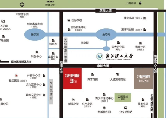 周边配套:教育方面,上虞区杭州湾未来城幼儿园距离小区 415m 左右,上虞区杭州湾未来城小学约 695m,金融街杭州湾学校距离小区 1.8km 左右。商业方面,小区距离上虞万达广场 14.2km 左右,距离较远,但小区自带 5000㎡沿街商铺,且距离至胜客便利 84m 左右,有利于居民采购日常必需品。医疗方面,绍兴市上虞人民医院距离小区 17.1km 左右,距离较远,就医不太方便。