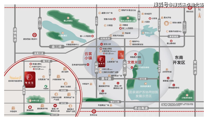 交通配套:紧邻南三环高架、G524 快速路,可直达相城、苏州金鸡湖;项目西侧有常熟高铁西站(在建),南侧 800 米处为轨交 S10 号线莫城站(在建);小区周边 1 公里内有多个公交站,最近的公交站点为和莫家园站,距离小区 160 米。