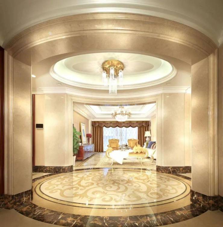 进门就是视觉盛宴,大中厅奢华雅致,客厅以精甄细选的大理石进行铺装,有着灰色调的高级质感。背景墙用了大面积的岩板,在金属线条的衬托下,呈现出历久弥新的臻妙质感。