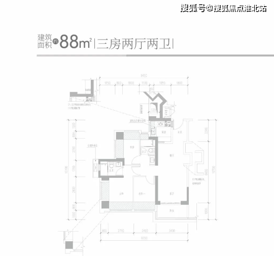 89㎡三房两厅一卫:竖厅格局,客厅 3.5 米开间,LDKB 一体化设计,S 墙设计预留冰箱位,3 个卧室宽度分别为 3.05 米、2.85 米、2.7 米,U 型厨房,得房率 73.87%,阳台进深 1.7 米,有西南或东南朝向。