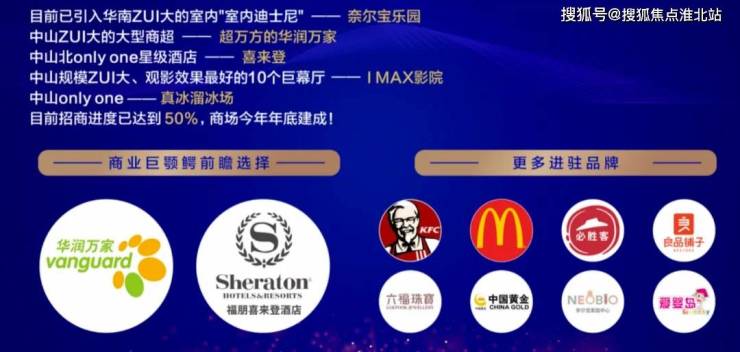 目前,众多知名品牌已经签约进驻,包括星级酒店--福朋喜来登酒店、中山最大的商超--1.3万㎡的华润万家超市、华南体量最大的"室内迪士尼"奈尔宝乐园,未来还会引进Dior、GUCCI、COACH等奢侈品牌。