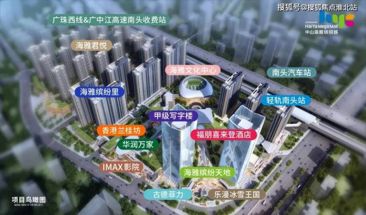 据悉,中山海雅缤纷城,位于广珠轻轨南头站旁、广珠西线高速南头出入口处,总建面约120万㎡。