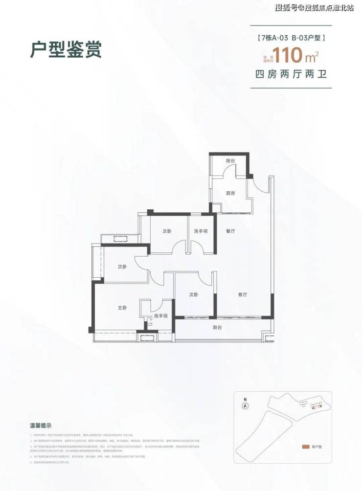 110㎡的4房2厅2卫,设计的是经典竖厅格局,进门入户玄关,LDKB一体化设计,四开间朝南,动静分区,客厅连接次卧出大阳台,L型厨房还带1个生活阳台,卫生间干湿分离,得房率约82%(不含赠送),东南朝向。