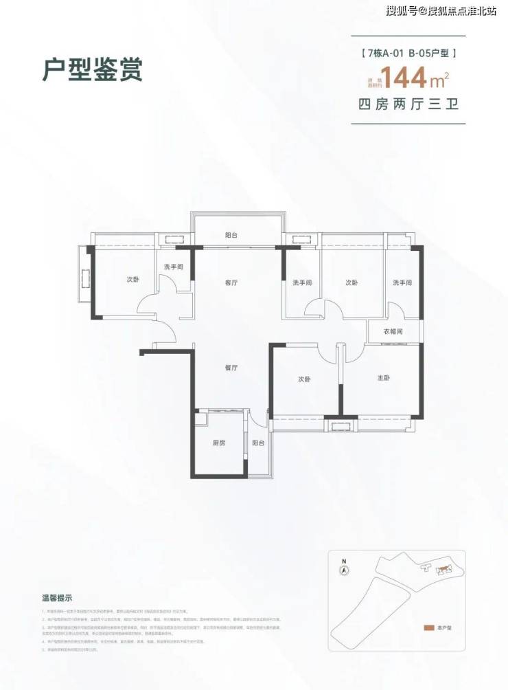 144㎡的4房2厅3卫,设计的是竖厅南北通透格局,进门入户玄关,LDKB一体化设计,双主卧套房,L型厨房还带1个生活阳台,公卫干湿分离,得房率约82%(不含赠送),阳台主朝西北向。