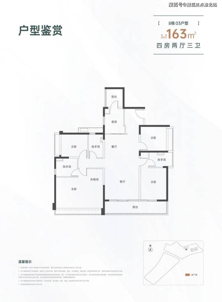 163㎡的4房2厅3卫,设计的是竖厅格局,一梯一户,进门入户玄关,LDKB一体化设计,三开间朝南,双主卧套房,客厅连接次卧出大阳台,L型厨房还带1个生活阳台,卫生间干湿分离,得房率约82%(不含赠送),东南朝向。