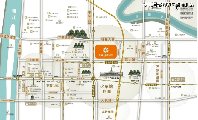 交通配套:项目紧邻地铁 2 号线、3 号线、7 号线,距离长沙火车站、五里牌等地铁口仅 50-400 米,周边还有 7 条主干道纵横交错,交通出行十分便捷。