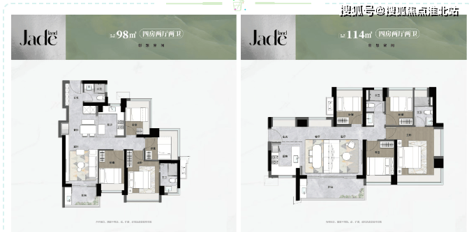 98㎡四房两卫:竖厅设计,四开间朝南,两个次卧 270 度飘窗,东南朝向。