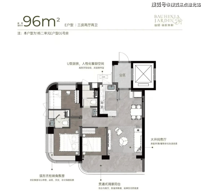 96㎡三房两厅两卫:竖厅格局,客厅 3.9 米开间,LDKB 一体化设计,三开间朝南,西南朝向。