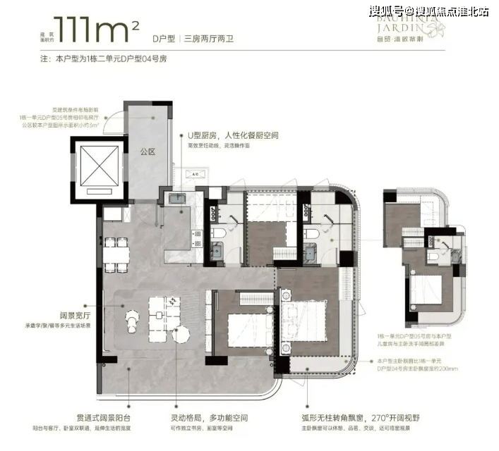 111㎡3+1 房两厅两卫:竖厅格局,客厅 5.15 米开间,LDKB 一体化设计,三开间朝南,有东南、西南两种朝向。