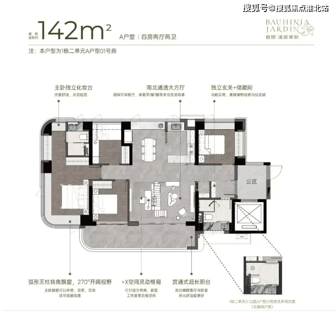 142㎡4+1 房两厅三卫:南北通,南北方厅设计,阔景四房。