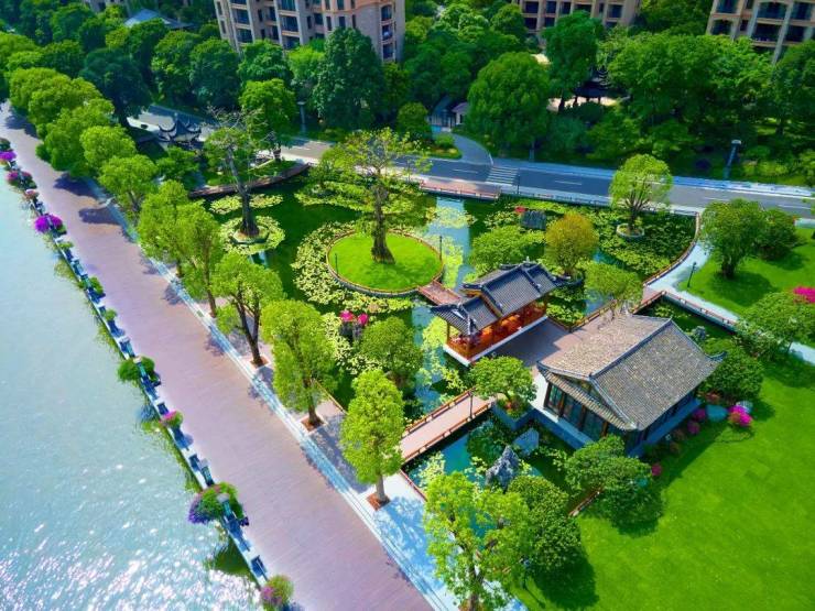 园林景观:以超过 4400㎡的水景为主体,运用榫卯工艺打造六角亭、茶轩等古韵建筑,全冠移植近百种珍贵名木,选用黄蜡石与太湖石等景石,引入荷花、睡莲等水生植物,营造出一步一景的中式园林景观。
