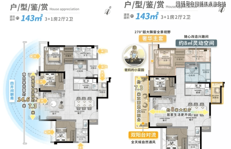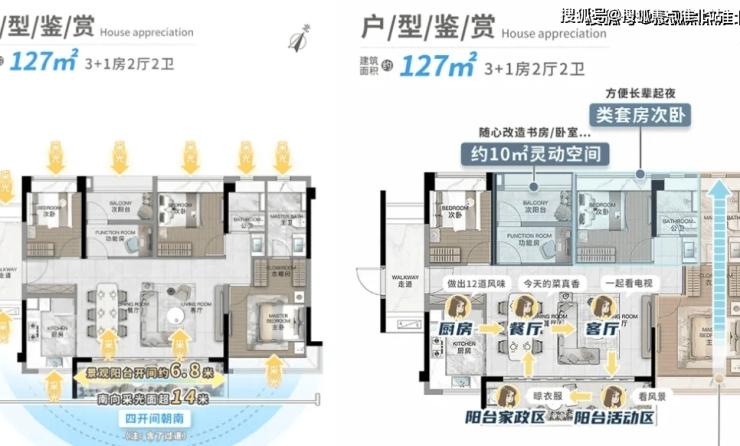 而128㎡3+1房则像是143㎡户型的缩小版,各个功能区的分布位置极为相似,只是尺度略有不同,大家可以根据预算灵活选择。