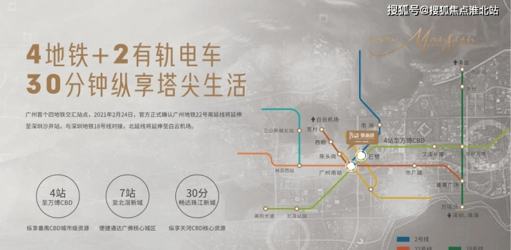 4地铁:2号线、22号线、7号线、佛山2号线。4站至万博CBD、7站至北滘新城、30分钟至珠江新城。