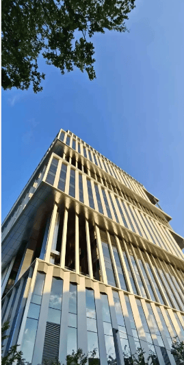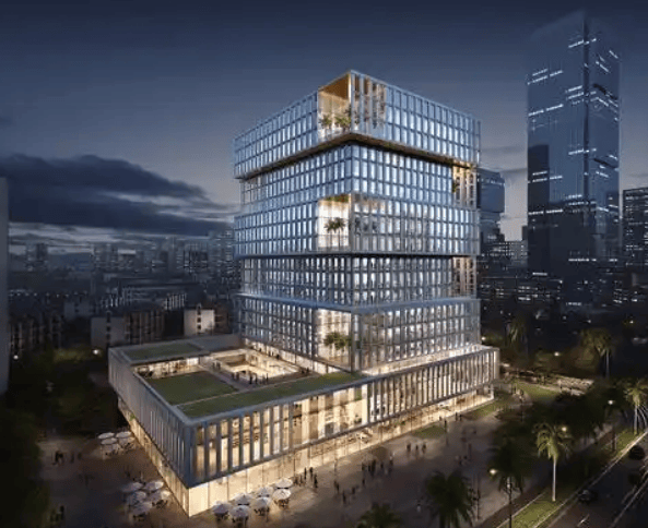 关键指标:占地约 1.05 万㎡(15.8 亩),总建面约 7.46 万㎡;容积率 4.5,绿化率 25%;地下 3 层,机动车位 464 个;10.5 米挑高大堂;8 部高速客梯 + 1 部 VIP 梯 + 1 部货梯(蒂森克虏伯);5A 智能楼宇 + 24 小时安防 + 日立 VRV 独立控温空调;标准层面积 2420㎡