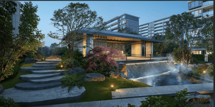 小区规划:园区以《嘉禾八景图》为蓝本进行设计,风雅亭、水系涌泉、置石造景等景观相辅相成,还打造了儿童活动空间、长者康养空间等全龄主题空间。地库采用 “幻影星空顶地库” 设计,莫兰迪配色,大堂处有星空顶挑檐。
