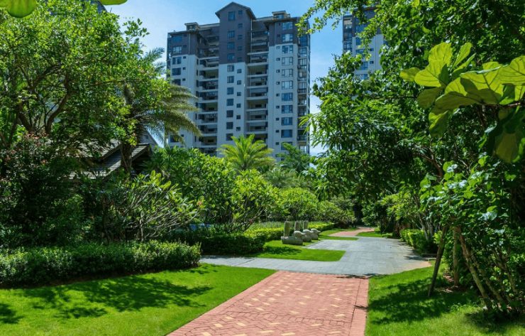 建筑与园林:项目由 10 栋东南亚风格建筑组成,采用贴砖立面设计。园林以东南亚风格为蓝本,种植东南热带树种植被,搭配天然木材、石材,营造出充满自然情趣的多层次空间。