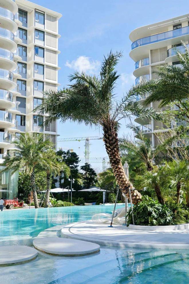 社区与园林:热带度假风园林,分 A/B/C 三个组团,各组团配业主食堂、无边际泳池、泛会所、儿童活动区、健身中心、私宴厅;外立面采用大面积玻璃幕墙 + 铝板,3.1–3.6m 层高,LDKB 宽厅,U 型大阳台,度假感极强。