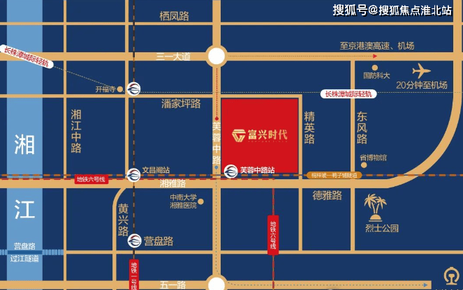 交通配套:未来在建地铁 6 号线湘雅医院站将与项目地下二层实现无缝对接,设有两个出入口,周边还有地铁 1 号线文昌阁站经过;距离长株潭城铁开福寺站约 1 公里左右;周边的湘雅医院站有多达 27 条公交线路经过。