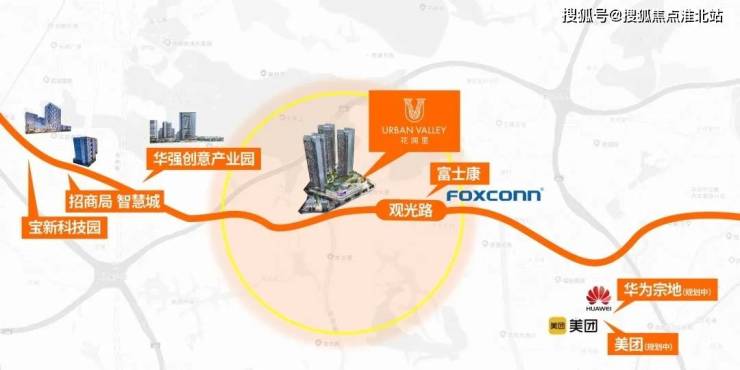 观光路,作为连通光明、观澜、大浪的核心主干道,沿途布局华强创意产业园、华润苹果小镇及富士康、华为、美团等具有世界级影响力企业,承载上下游产业智能化高端化发展红利,成就区域价值高地,未来堪称深圳北部深南大道;