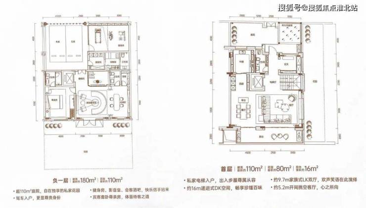 其中,负一层建面约180㎡,带有超110㎡独立庭院;首层约9.7米LK双厅,5.2米开间挑空客厅;