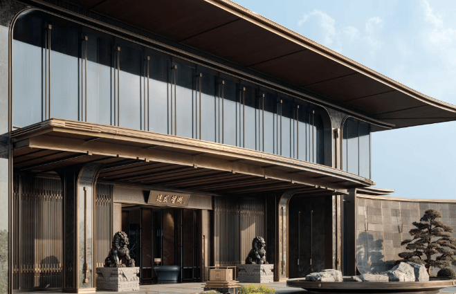 东方美学建筑:建筑立面采用铝板及石材,主体立面以水平线条为框架,飞檐塔冠造型取法华夏都城的建筑礼仪,大面积的 LOW-E 玻璃搭配金色铝板线条,打造出镜面感建筑立面,展现专属于沙湖的东方美学网易手机网。