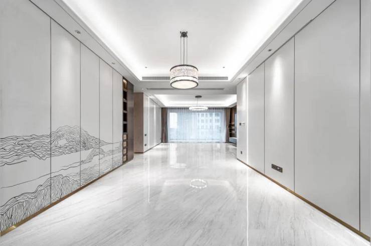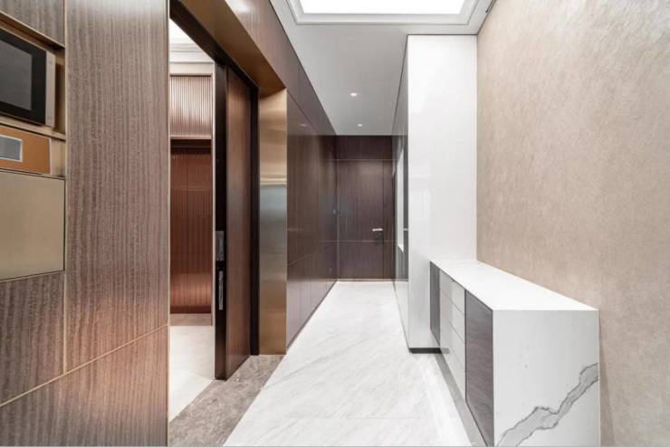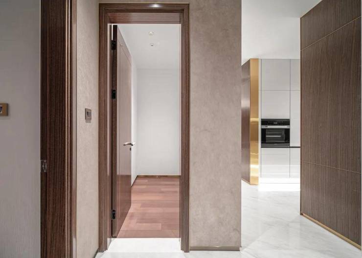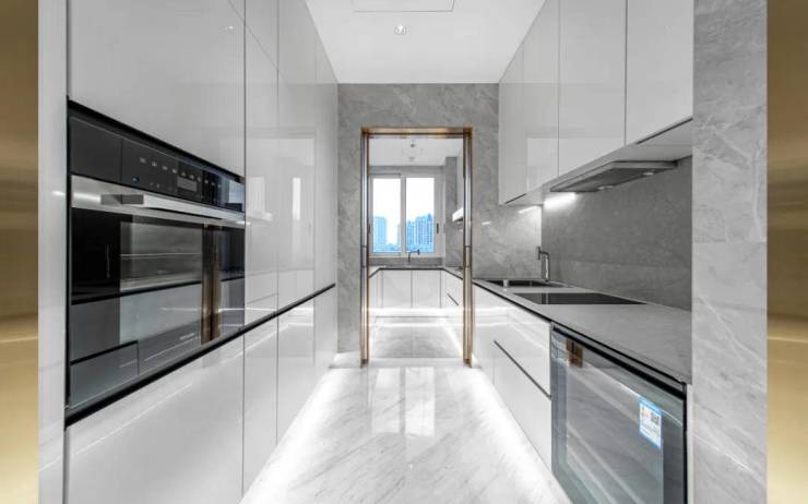 另一个让人切实感受气派层高的地方就是厨房,比常见的做了集成吊顶的厨房高太多。同时设计了中西双厨,并不像市面上仅仅加个岛台,而是完完整整的双厨布局。
