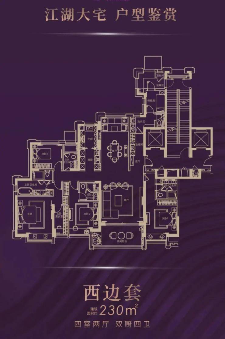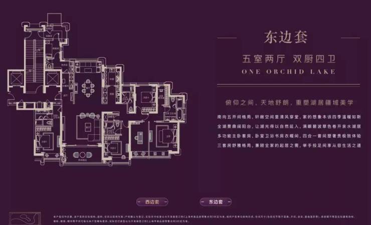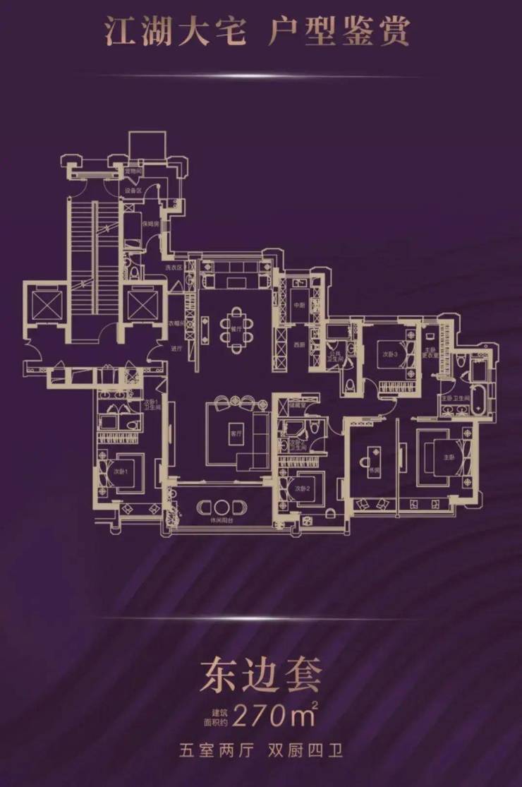 两梯两户的大平层,西边套为约230㎡4房2厅4卫,东边套是约270㎡5房2厅4卫。以约270㎡东边套为例,从户型图上看,直观的就是霸气的五开间朝南。
