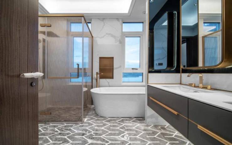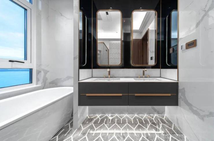 主卧堪比总统套房,卧室、卫生间、书房、衣帽间4合一,其中主卫双台盆+浴缸+淋浴,尺度比一般商品房的卧室都大。