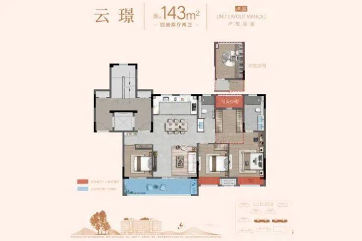 小高层建面约118m²:餐客厅面积明显增大,主卧带有独立衣帽间,整体尺度上更加舒适。