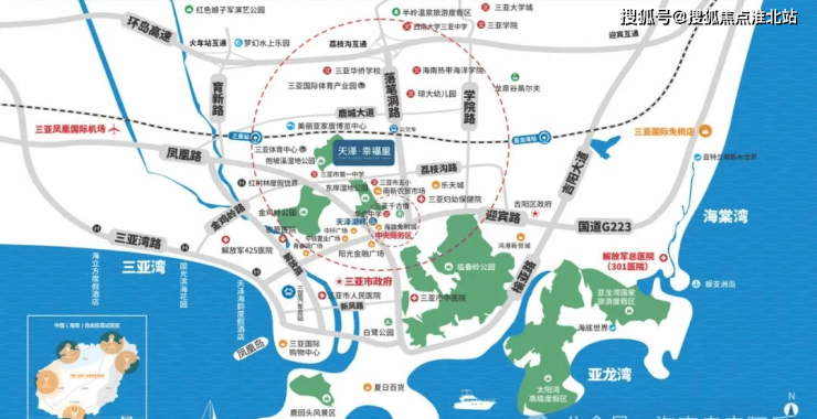 位于三亚市核心交通路网,向南行驶1公里到达中央商务区,北向1公里到达环岛高速出入口,西向4公里到达三亚动车站,1、3、21、33路公交到站,近揽东岸总部中央商务区、乐天城综合体、鸿港新贸城、海旅免税城等商圈;