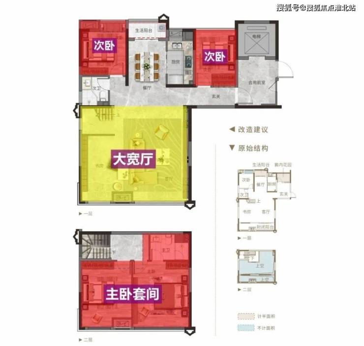 如一楼两室两厅设计,二楼则改造成两间卧室,一间作为套房式主卧,配备独卫和衣帽间。