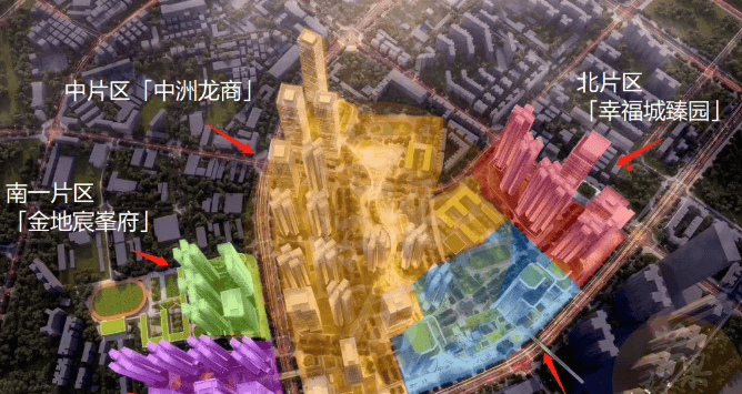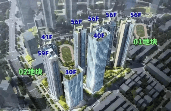 项目概况:总占地面积约 3.16 万㎡,总建筑面积约 38.88 万㎡,分两个地块开发。01-01 地块容积率 8.81,绿化率 40.01%,规划 4 栋 56 层住宅 + 1 栋 40 层办公;01-02 地块容积率 8.31,绿化率 40.01%,规划 2 栋 41-59 层住宅 + 1 栋 30 层办公 + 1 所 9 班制幼儿园。项目共规划 1202 套商品房(含部分回迁房),梯户比为 3 梯 4 户、3 梯 5 户、3 梯 6 户,车位 2717 个,车位比约 1:1.25。