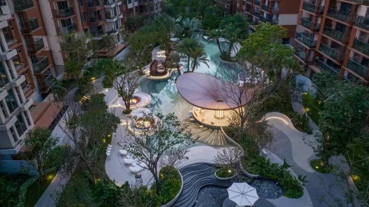 景观设计:园林占地 12 万平米,以现代中式园林风格设计,布置五大景观轴以及十大主题园。小区内有重金打造的下沉式院落园林会所,面积 2213.04㎡,会所内外设有室内恒温游泳池、室外景观泳池等。