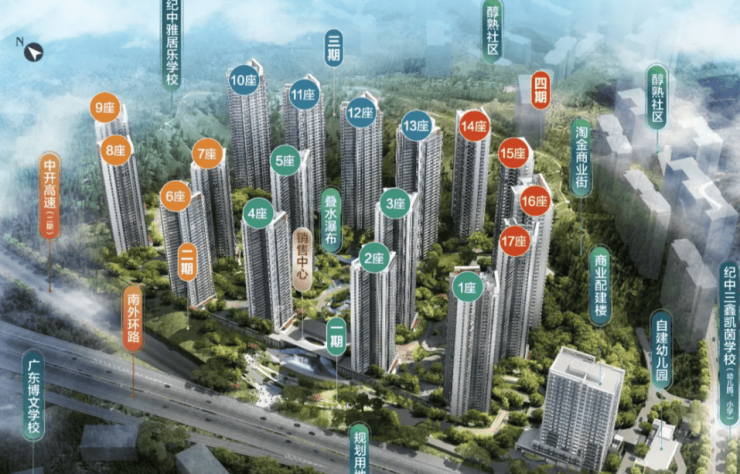 建筑设计:采用现代中式建筑风格,深沉大气,雅致而稳重。楼栋为 32-39 层的高层、超高层,依山而建,点式布局,最宽楼距超 65 米。