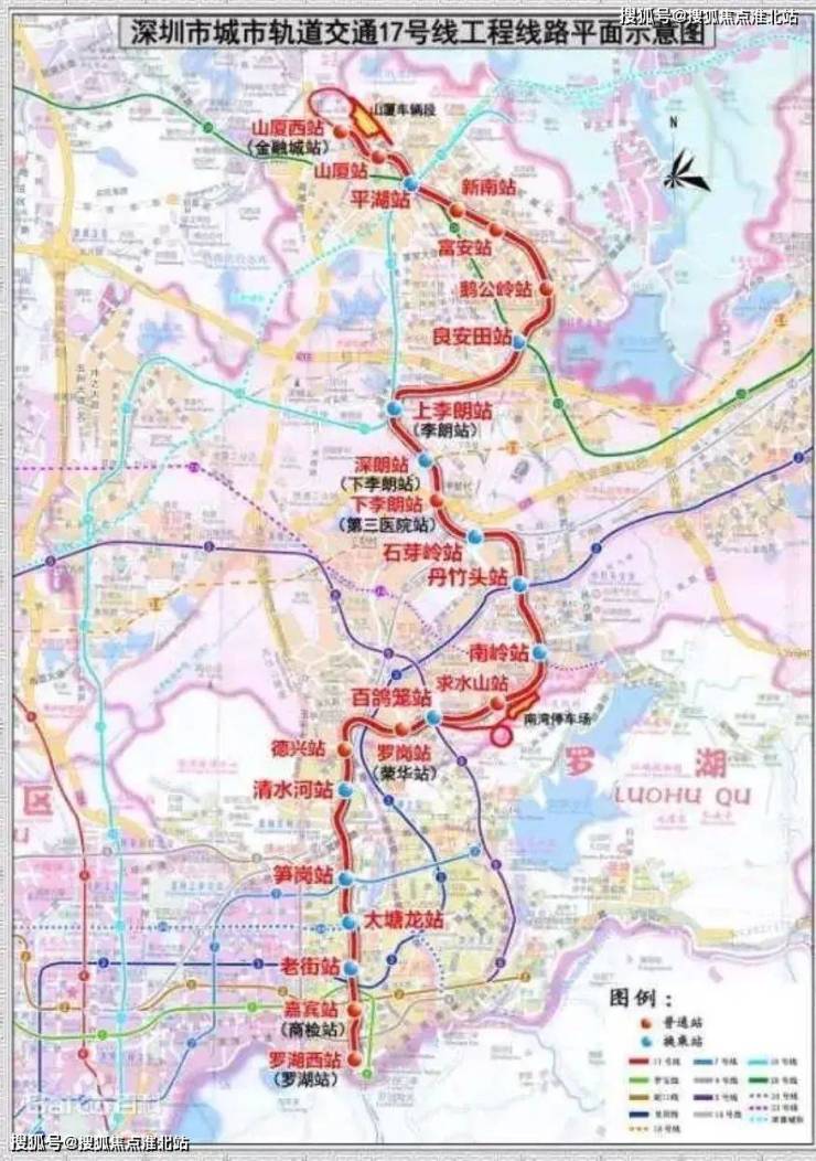 从地图看,17号线链接龙岗平湖、布吉片区和罗湖中心区,被市民定义为民生线。线路起于已建成的深圳地铁1号线罗湖站,全长约29.3公里,全为地下线;共设25座车站,全为地下车站。站点(暂定):罗湖站、商检站、老街站、大塘龙站、笋岗站、清水河站、德兴站、荣华路站、百鸽笼站、求水山站、南岭站、沙塘布站、丹竹头站、石芽岭站、第三医院站、下李朗站、李朗站、良安田站、鹅公岭站、富安站、新南站、平湖站、山厦站、金融城站。