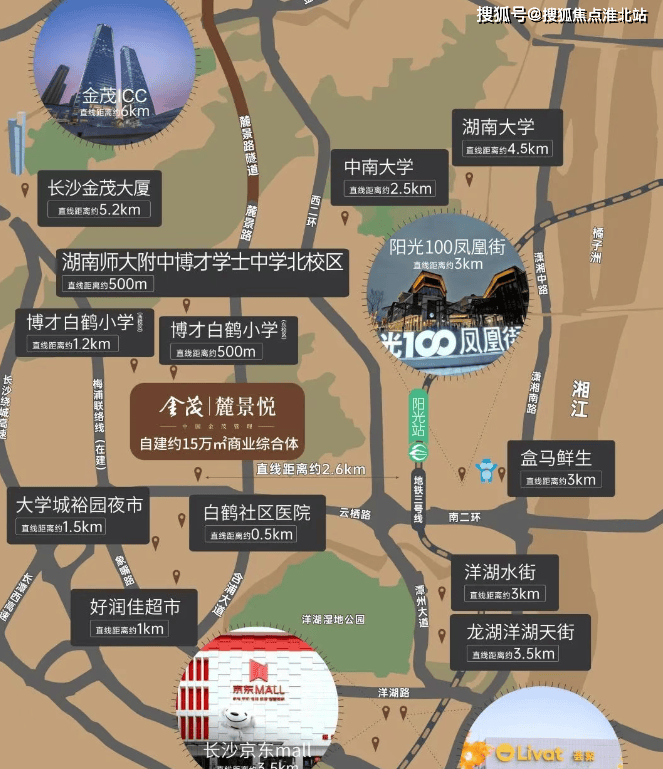 商业配套:项目东边规划有大型商业综合体,需住宅交付后动工。目前 1KM 范围内商业较少,可前往直线距离 3.5KM 的洋湖、6KM 的梅溪湖或 9KM 的五一商圈购物。