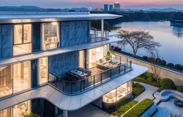 建筑设计:采用航空级铝板立面搭配 12mm 超白玻幕墙,窗墙比达 0.6,首创长三角住宅采光纪录。建筑设计灵感源于白鹭展翅,立面提取舒展线条,还原白鹭形态,转角采用超大弧形曲面铝板挑檐与定制曲面落地玻璃,造型优美且视野绝佳。
