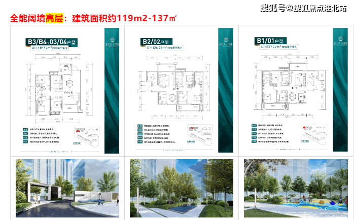 四居室户型:面积在 119 平 - 137 平之间,主打全明格局,户型方正。如 119㎡的四室两厅两卫户型,三开间朝南,餐客厅一体连接约 4 米南向景观阳台,室内空气流通顺畅,L 型厨房设计,洗切炒一气呵成,卧室均分布在户型右侧,动静分区合理。