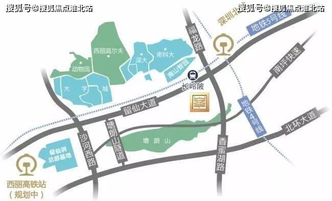 5号线目前一站可到达深圳北,南延线连接前海片区。将来可通过5号线连接规划中的13号地铁线和西丽交通枢纽,通达留仙洞总部基地、科技园和后海总部基地等重点规划片区。此外,项目还是双高铁站辐射(深圳北站、西丽站)。