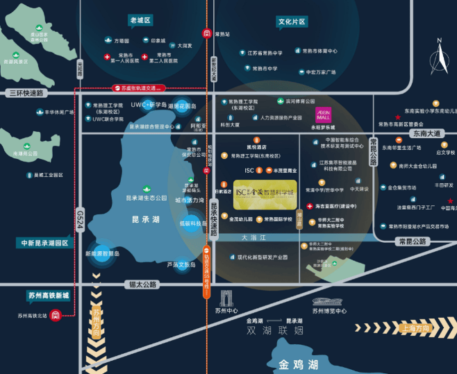 周边配套:交通上,毗邻昆承快速路、东南大道、南三环高架等主干道,周边公交站点密集,距 “国际学校(湖山路)” 站仅 192 米,且规划有轨道交通站点。教育方面,有 UWC 世界联合学院、华东师范大学第二附属中学常熟实验学校、东南幼儿园承文园等。商业配套丰富,步行 10 分钟可达 18.1 万㎡的永旺梦乐城,还有丰茂里商业街、阿那亚创新街区等。医疗方面,距常熟海吉亚医院约 2 公里,距新宁医院约 1.5 公里。此外,周边还有日航酒店、凯悦酒店等五星级酒店。