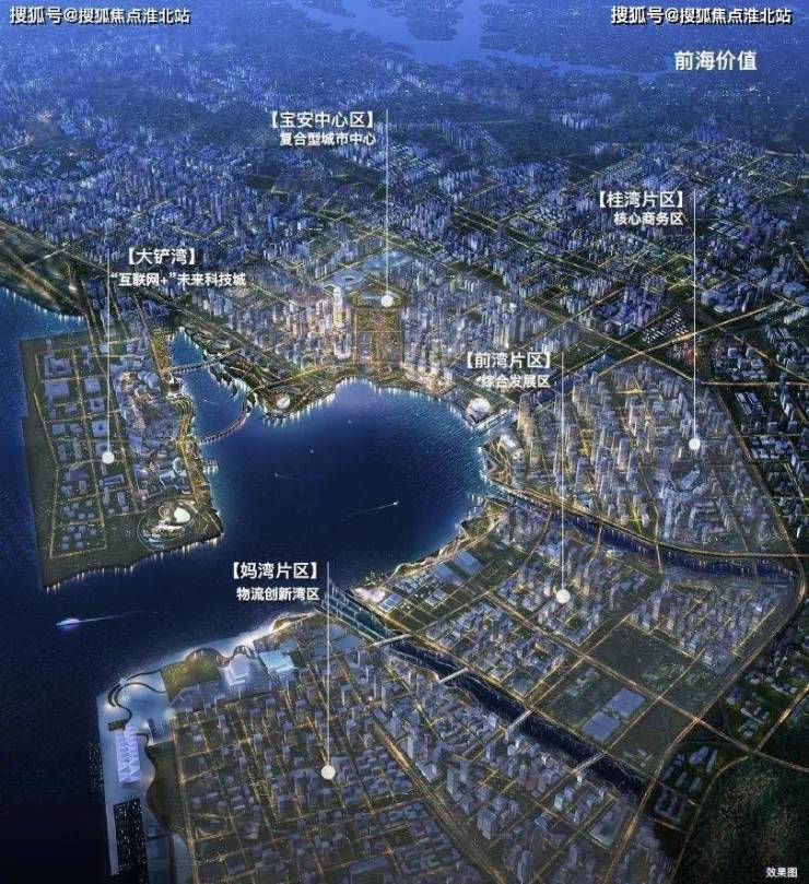 内湾由宝中、腾讯未来科技城(大铲湾)、妈湾、前湾、桂湾等片区环绕形成,为前海扩容后的核心组团,也是深圳西海岸上的湾区门户。