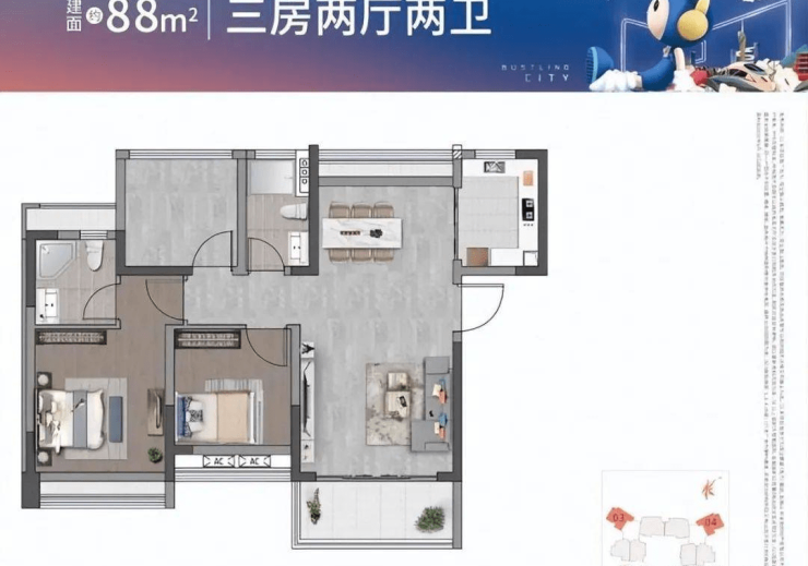 建面约88m²户型,做出了3房2厅2卫,实用率非常。