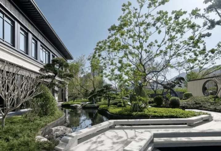 内部:中式两进山水园林(叠石、水景、连廊、亭台)、泳池、儿童乐园、健身步道、精装大堂、24h 安保
