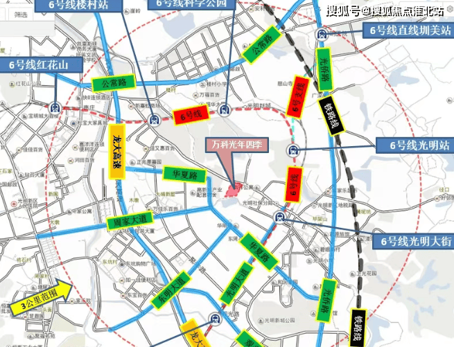 交通配套:距 6 号线光明大街站直线距离约 800 米,未来还有 6 号线支线、13 号线(在建中)等地铁线路环绕。项目 3 公里内覆盖的主干道有光明大道、公常路、光侨路等,通过光明大道可连接深圳各区。