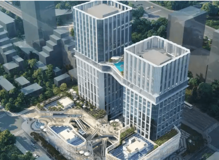 规模与指标:占地约 11155㎡(约 16.7 亩),总建面约 85908.7㎡;容积率 5.0,绿化率 15%;双子塔造型,东塔 20 层(商务办公,3-20 层分低 / 中 / 高区,共 147 套),西塔 18 层(雅诗阁服务式公寓),裙楼 3 层(局部 4 层,27 套国际商业);地下 3 层车库,机动车位 474 个(规划调整后);建筑最高约 100 米